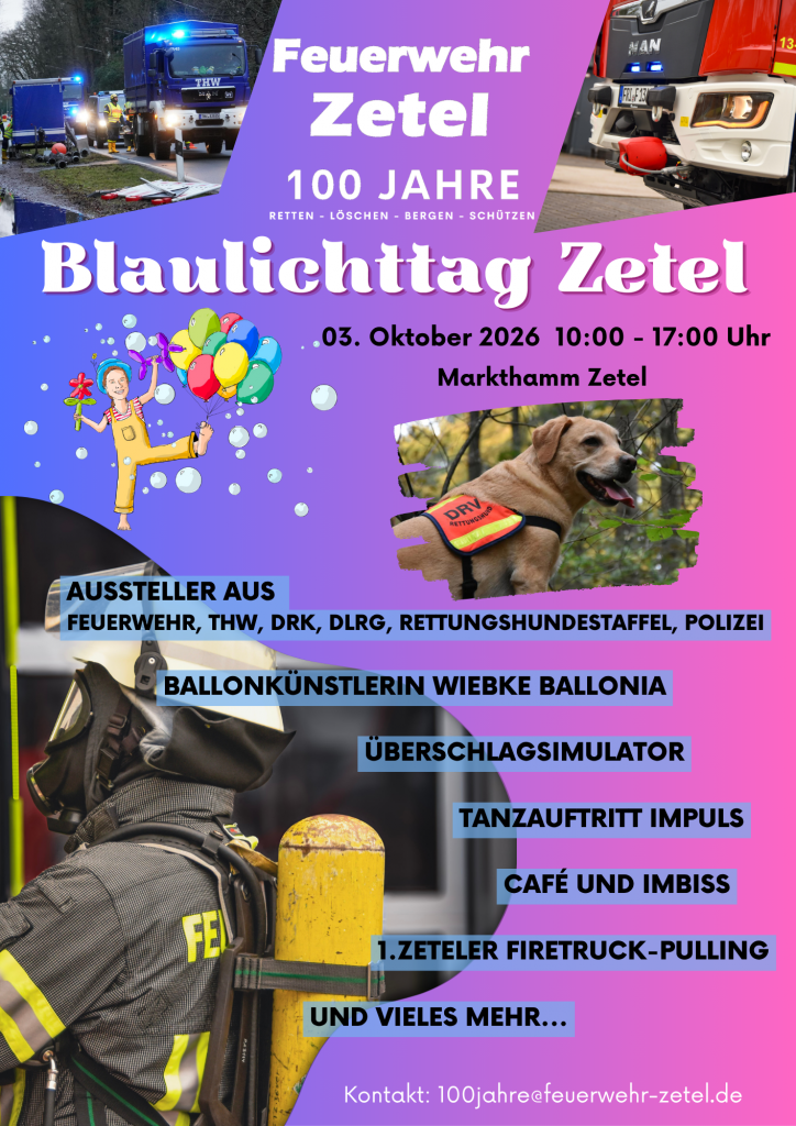 Am 03.10.2026 findet auf dem Markthamm in Zetel ein Blaulichttag statt. Hier stellen sich verschiedene Organisationen aus der Blaulichtfamilie vor. Einige Mitmach-Aktionen für Groß und Klein sind für diesen Tag geplant. Es wird ein buntes Tagesprogramm geben. Details dazu folgen! Seid gespannt!