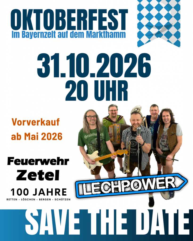 Am 31.10.2026 soll dann so richtig gefeiert werden und zwar im Bayernzelt auf dem Markthamm. Für die richtige Unterhaltung sorgt die Band „Lech-Power“. Die Band hat bereits in der Vergangenheit viele Besucher von regionalen Oktoberfest-Veranstaltungen begeistert (damals unter dem Namen Lechschwaben). In ausgelassener Stimmung kann hier das eine oder andere Mass Oktoberfestbier genossen werden. Auch einen bayrischen Imbiss wird es geben.