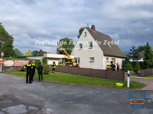Bei den Löscharbeiten im Dachbereich wurden die Einsatzkräfte durch den Bauhof Zetel mittels Teleskoplader unterstützt.