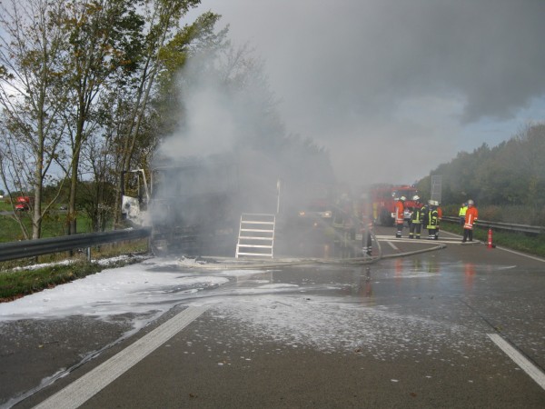 Ein Kiestransporter war vermutlich aufgrund eines technischen Defektes hinter der Anschlussstelle Zetel in Brand geraten. Der Fahrer stoppte das Fahrzeug und gab einen Notruf ab. Bei unserer Ankunft brannte die Sattelzugmaschine bereits in voller Ausdehnung. Mithilfe eines Schwerschaumrohrs konnte der Brand schließlich von zwei Trupps unter Atemschutz gelöscht werden. Kurioser Weise sprang der Fahrzeugmotor während der Löscharbeiten noch einmal an.